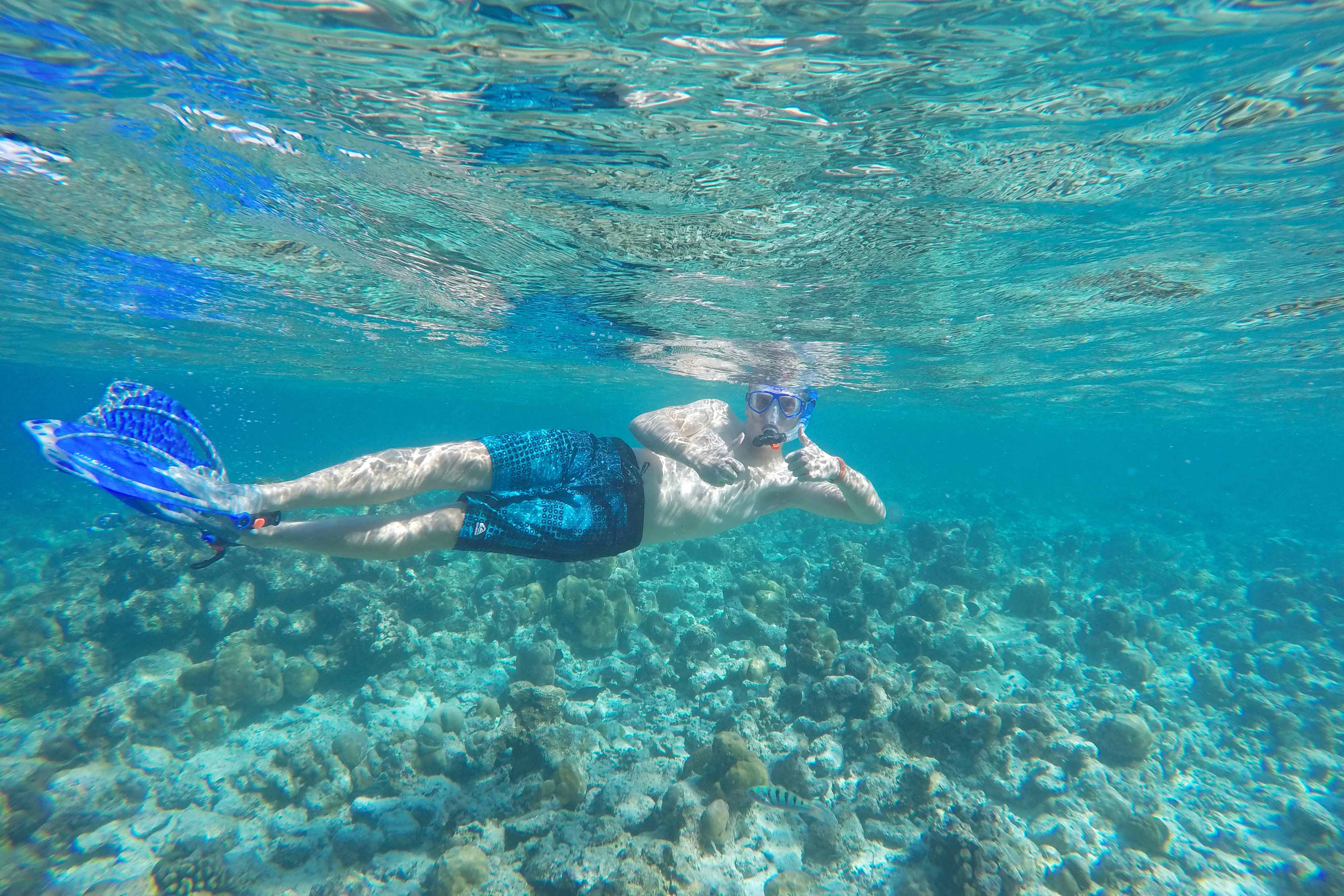 Ein heißer Tipp ist das Schnorcheln. An den ersten beiden Tagen war das Wasser noch etwas aufgewühlt und diesig. Das bessert sich an Tag drei. Wolke ist keine mehr am Himmel zu sehen. Entsprechend gut ist die Sicht im Wasser.